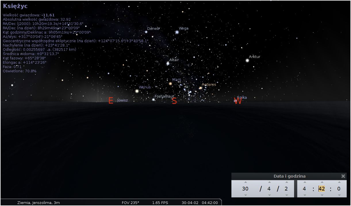 1*/ Obiekty i pojęcia ( źródła : Wikipedia i Kopaliński - Słownik Wyrazów Obcych ) D1 / Jowisz - Planetę znali astronomowie w czasach starożytnych, była związana z mitologią i wierzeniami religijnymi wielu kultur. Rzymianie nazwali planetę na cześć najważniejszego bóstwa swojej mitologii – Jowisza[4]. Obserwowany z Ziemi Jowisz może osiągnąć jasność do −2,95m. Jest to trzeci najjaśniejszy obiekt na nocnym niebie po Księżycu i Wenus (okresowo, w momencie wielkiej opozycji, jasnością może mu dorównywać Mars). Jowisz, Jupiter (łac. Iuppiter) – w mitologii rzymskiej bóg nieba, burzy i deszczu[1], najwyższy władca nieba i ziemi, ojciec bogów. Był źródłem władzy (łac. imperium), jaką dzierżyli rzymscy urzędnicy. Rzymscy władcy i wodzowie starali się pozować na ludzkie ucieleśnienie czy odzwierciedlenie Jowisza. Pospolicie utożsamiany jest z greckim Zeusem, z czasem przejął jego cechy. Atrybutami Jowisza były piorun i orzeł. Syn Saturna. W rzeczywistości jest to (tożsamy z Zeusem) praindoeuropejski bóg dziennego nieboskłonu, burzy i piorunów. Obie nazwy, grecka i łacińska, wywodzą się z praindoeuropejskiego imienia Dieus ph2ter, co w wyniku różnych przekształceń fonetycznych dało łacińskie Iuppiter (Iovis + pater). Od dopełniacza (genetivus) tego imienia, brzmiącego Iovis, pochodzi polskie imię tego bóstwa, Jowisz. Obliczenie lokalnej godziny Pierwsza godzina zaczyna się przed świtem, słońce znajduje się poniżej horyzontu . Jedenasta godzina trwa jeszcze , kiedy słońce jest już poniżej horyzontu ale niebo nie pociemniało całkiem .Kiedy pociemnieje , to zapada zmrok i wówczas zaczyna się godzina dwunasta rys.4 ![]() rys.4 Dokładne wyliczenia Dokładne wyliczenia momentów wyjścia księżyca , najpierw w dniu 30-3-4 ( po rozpoczęciu „wieczerzy”, jest to moment , kiedy po wyjściu księżyca godzina 7H ma „rękę w misie”) i drugiego , kiedy ponownie pojawia się w tej samej godzinie 7H 30-4-2 13:12 ( tym razem jest to godzina „wydania” ) . Zjawisko jest podobne ale zostało w historyjce inaczej nazwane . . Pierwszy przypadek Odliczamy godziny od świtu 30-3-4 4:17 i w godzinie 30-3-4 12:21 , w godzinie dnia 9h4' ( 9-tej i 4-tej sekundzie , godzinie 60-minutowej ) księżyc jest cały ponad horyzontem czyli jest w misie ( zrzut ekranu >>tutaj ) . Zachód słońca 30-3-4 17:29 ( zrzut >>tutaj ) . Po ponownym przeliczeniu długości godzin w tym dniu ( otrzymuję 1H = 72s ) i to daje , że 9h4' = 544' / 72' = 7,55H= 7H:39,6' . Czyli moment wyjścia księżyca dokonał się w godzinie 7H liczonej jak w tamtych czasach . Drugi przypadek Kolejne wyjście księżyca w godzinie 7H , przy jednoczesnym pojawieniu się Jowisza o świcie 30-4-2 4:38 ( zrzut >>tutaj ) . Zachód w tym dniu 30-4-2- 18:50 ( zrzut >>tutaj ) . W tym dniu , tego miesiąca godzina 14h:12' / 11 = 852'/11= 77,5' czyli 1H=77,5' . Wyjście księżyca ponad horyzont miało miejsce 30-4-2 13:12 ( zrzut >>tutaj ) , co miało miejsce w godzinie ( 10h mniej 26' daje 9h34' ) , dalej 9h34'= 574' /77,5' = 7,4H = 7H:31' . To oznacza , że „ten” , który trzymał rękę w misie w marcu podczas wieczerzy , ten sam „wydał” Księżyc w kwietniu , w obecności Jowisza . Pomiędzy tymi dwoma terminami podobne zdarzenie nie zachodzi .